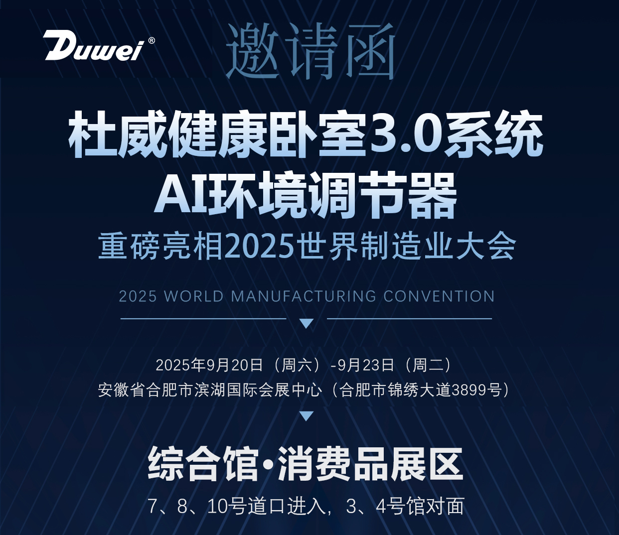 9月20日,2025世界制造业大会在合肥市滨湖国际会展中心正式开幕,届时杜威健康卧室3.0系统-AI环境调节器将重磅亮相,诚邀您来参观体验!
